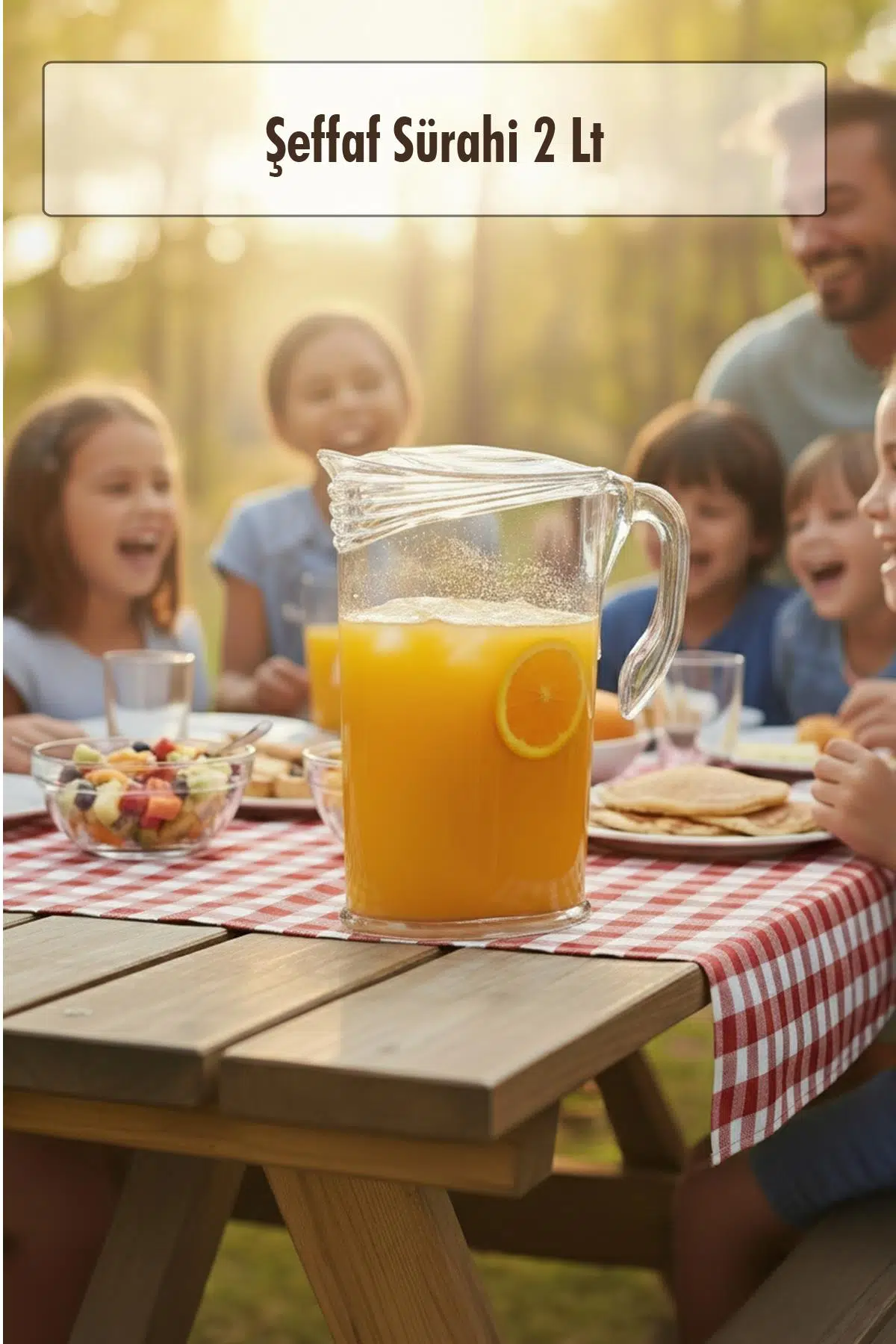 Şeffaf akrilik sürahi, 2 litrelik hacmiyle su, meşrubat ve limonata servislerinde pratik kullanım sunar. İnce formu sayesinde buzdolabı kapak rafına kolayca sığar ve yer tasarrufu sağlar.