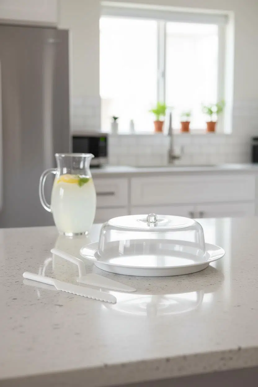 Şık sofralar ve keyifli çay saatleri için tasarlanan akrilik kek fanusu ve servis seti, sade beyaz rengiyle mutfağınıza zarif bir dokunuş katar. Pasta, kek veya kurabiye sunumlarınızda hem estetik hem de hijyenik bir kullanım sunar.