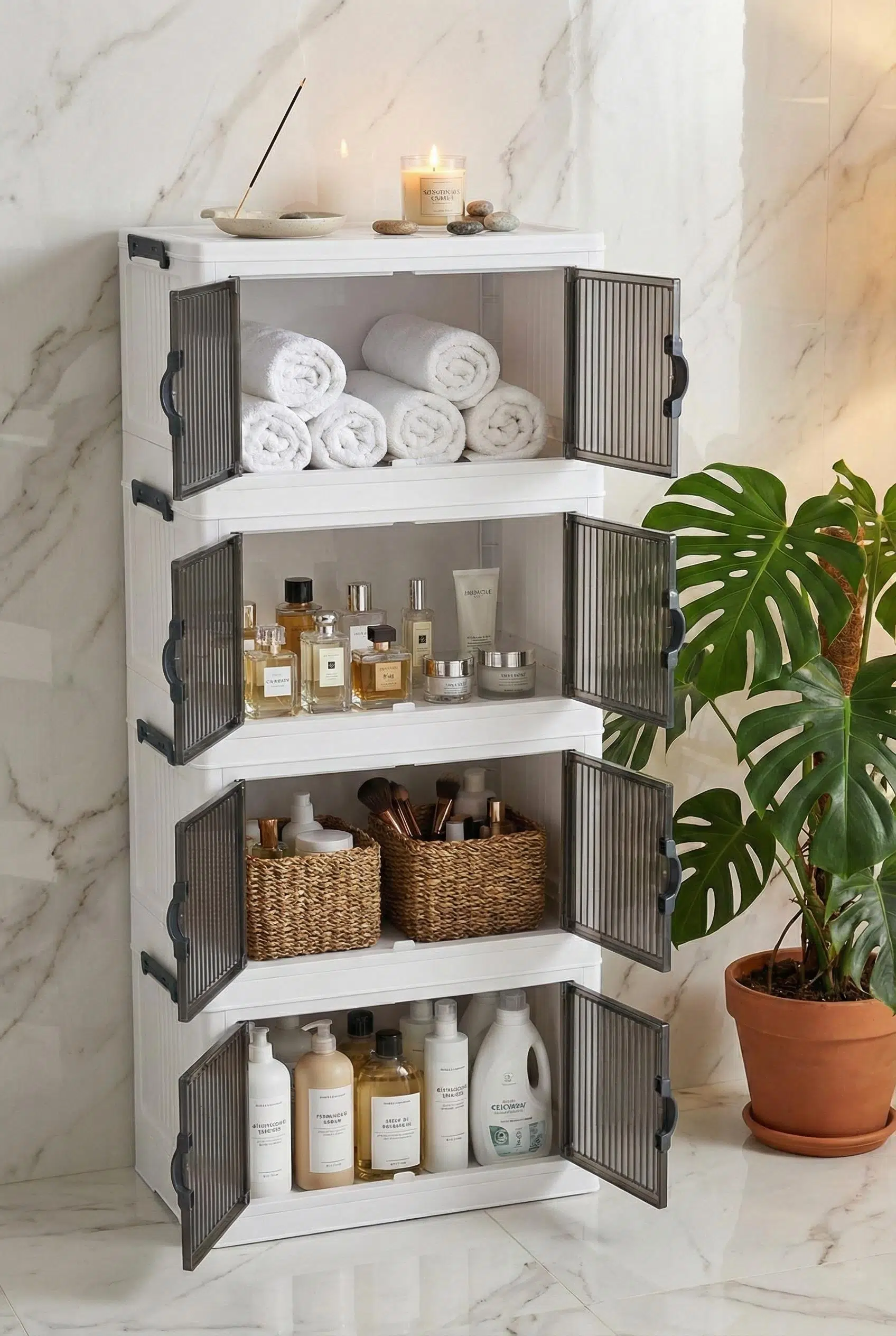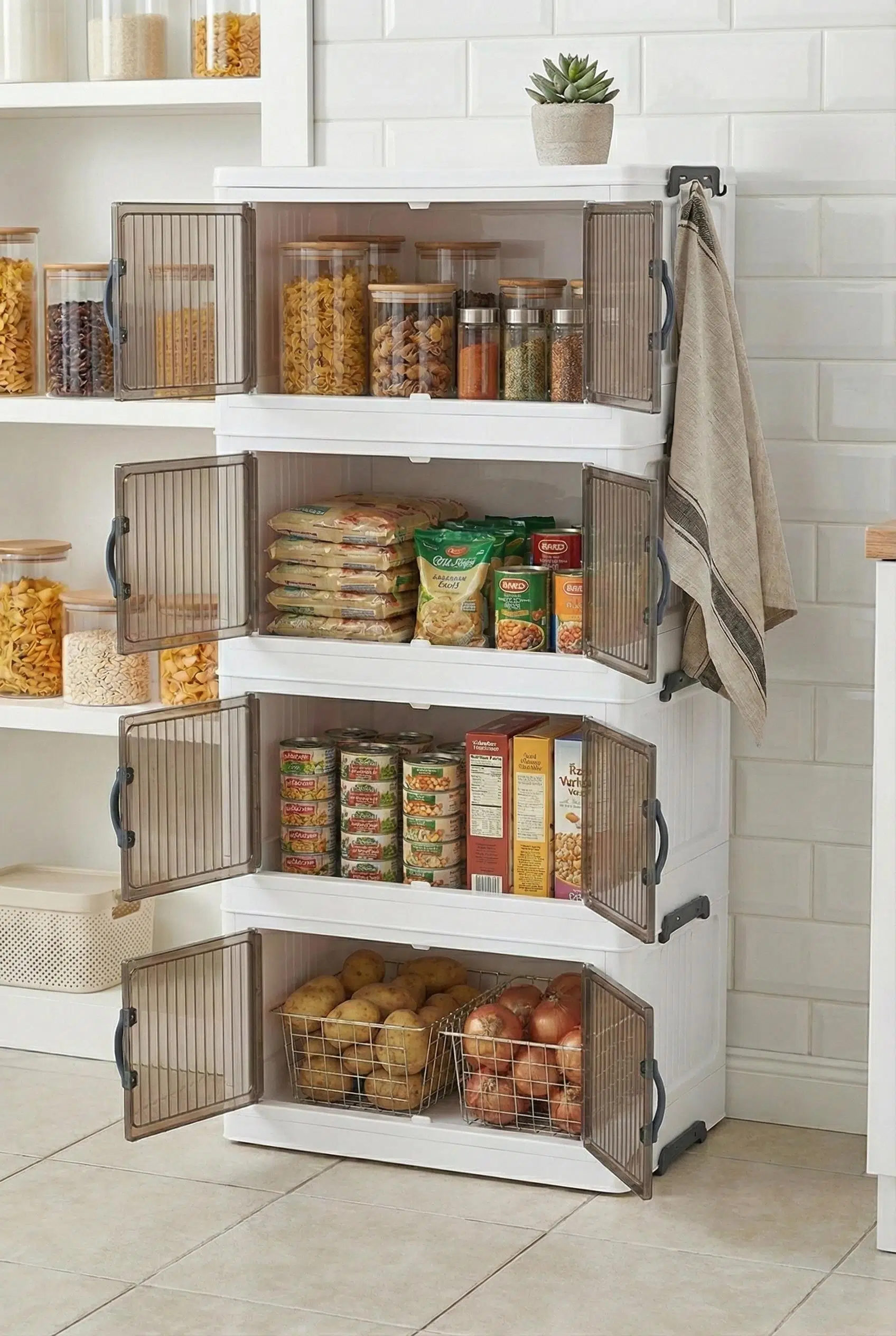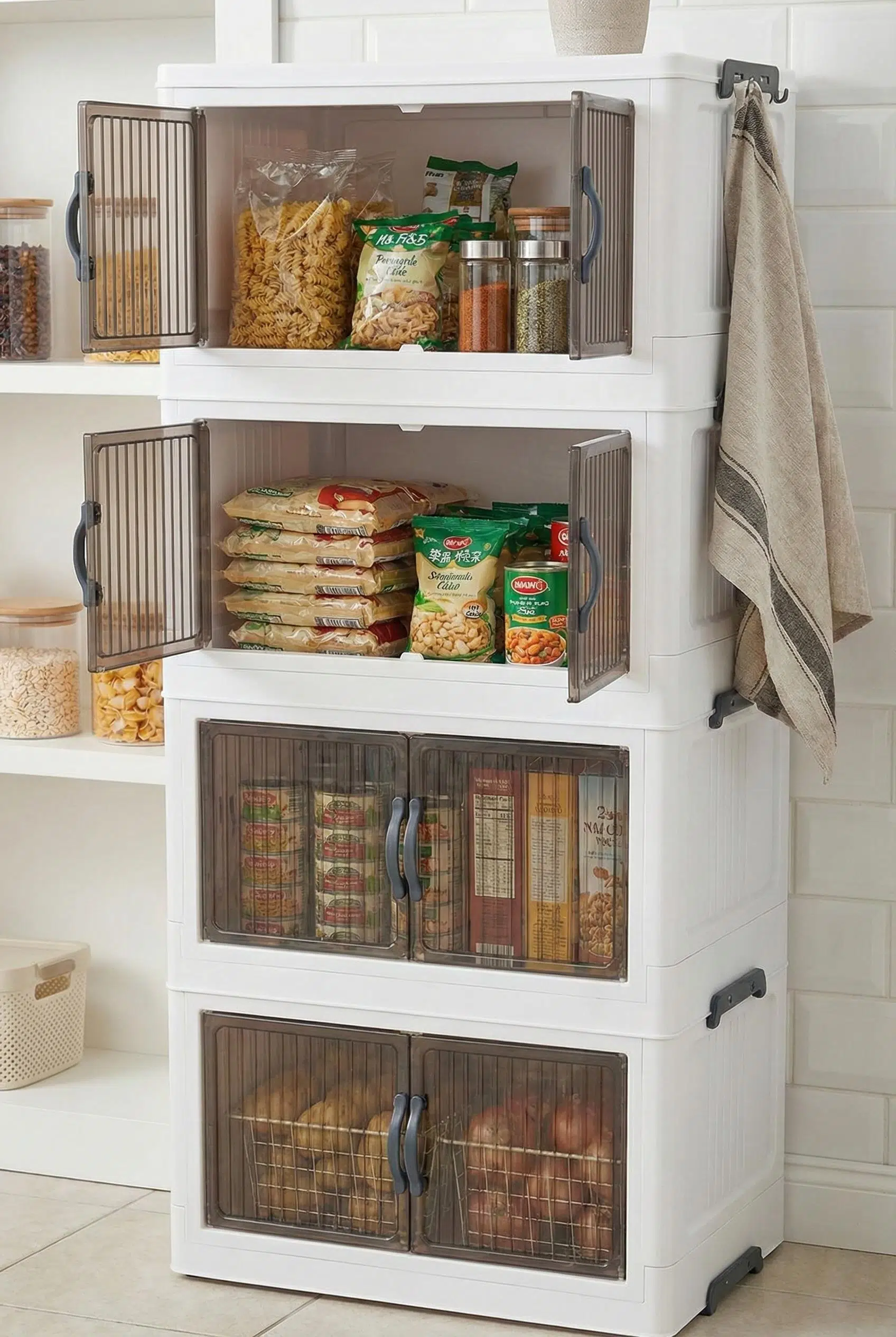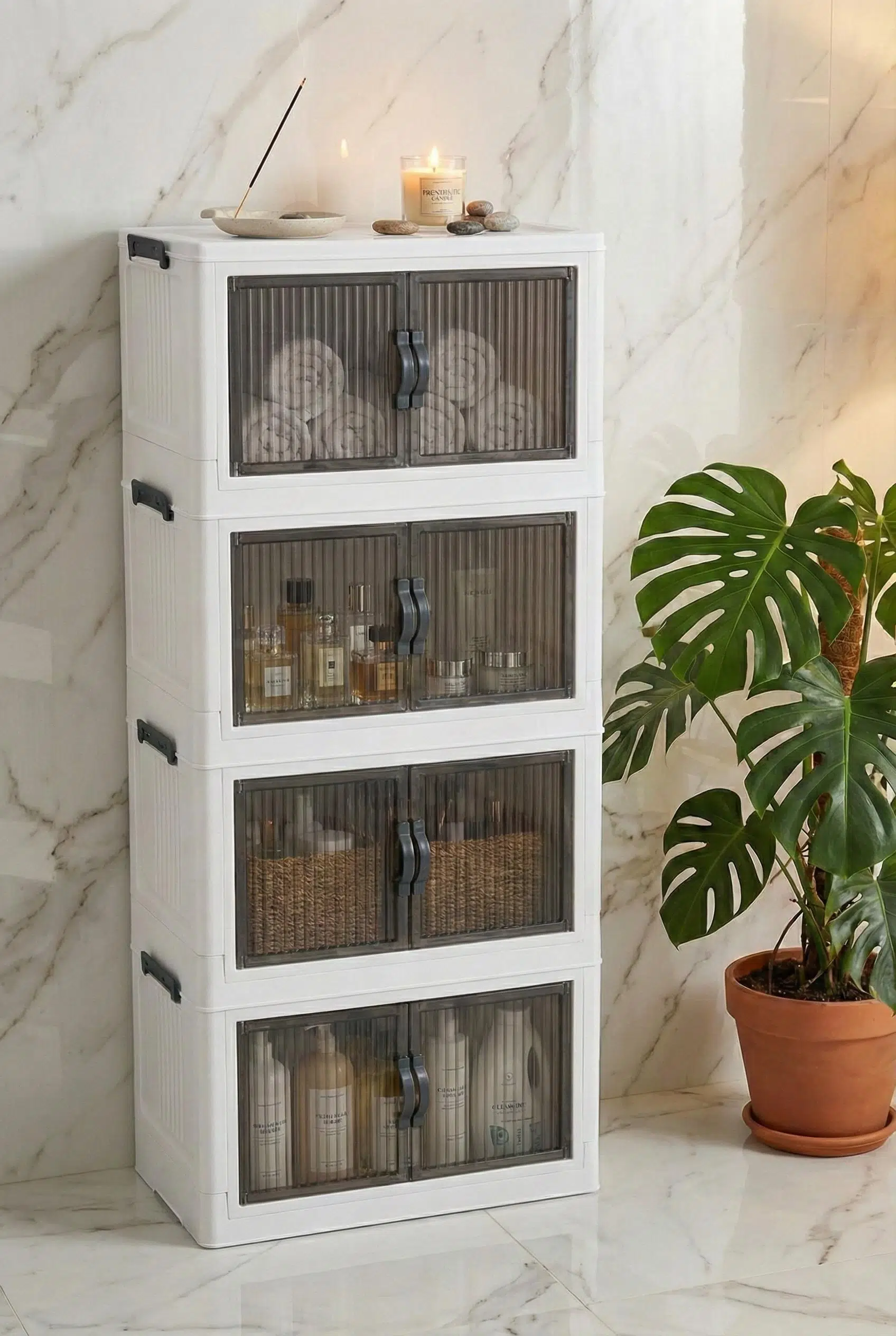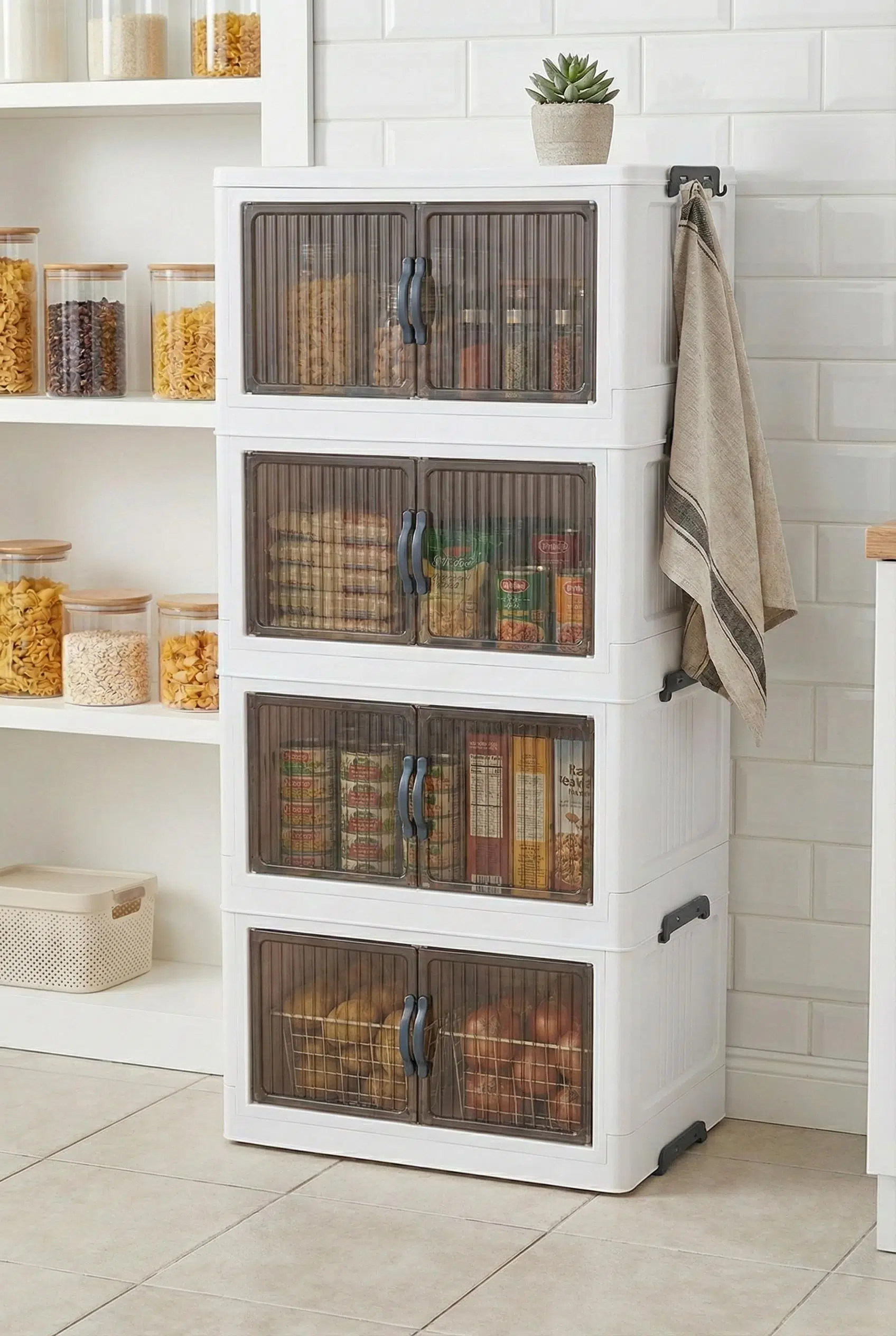 Evinizde profesyonel bir düzenleme deneyimi sunan bu dört katlı portatif dolap, füme şeffaf kapakları ve geniş iç hacmiyle mutfak kilerinden banyo düzenine kadar her alanda şık bir saklama çözümü sunar.