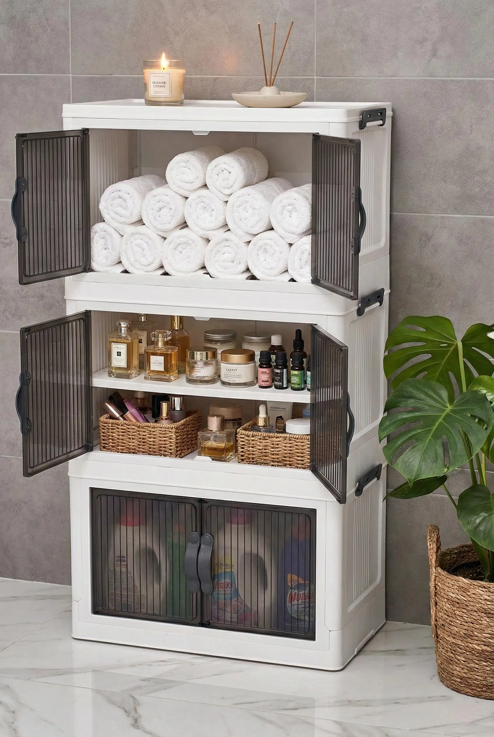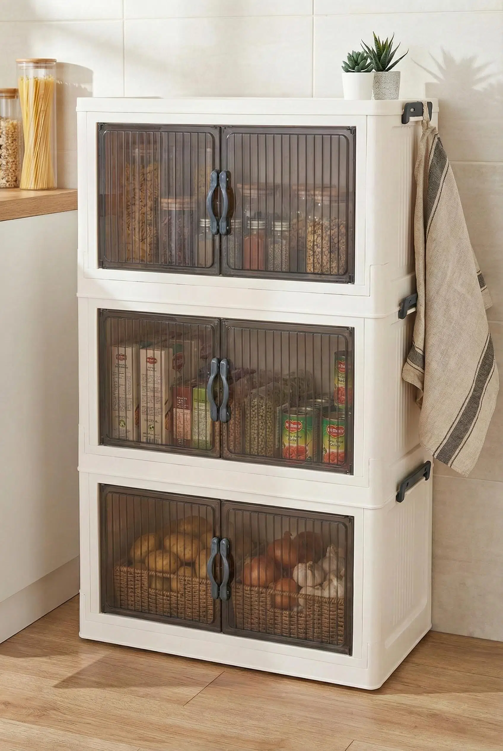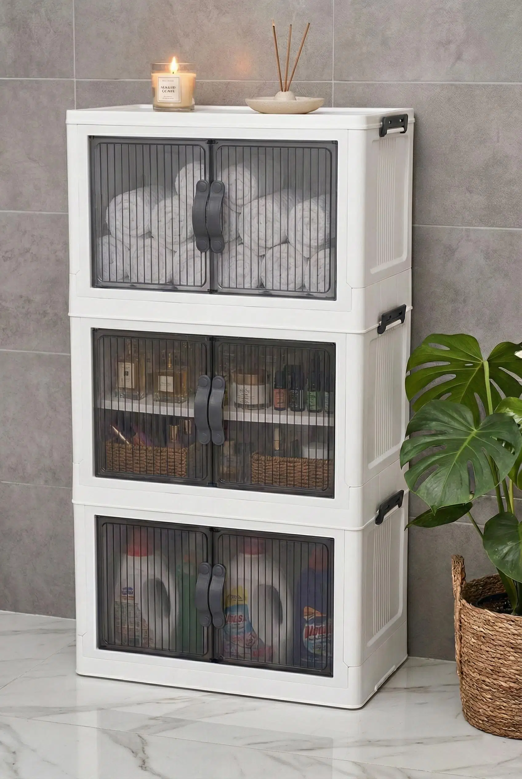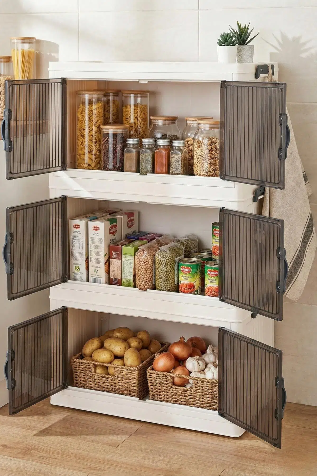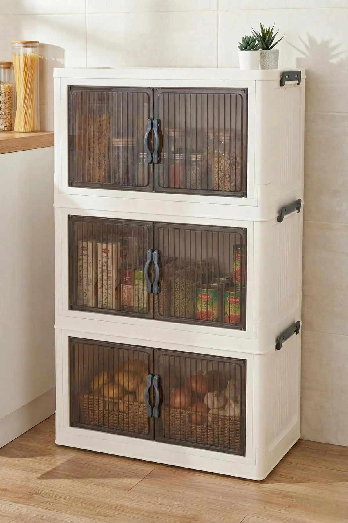Evinizin her köşesinde düzeni sağlamak için tasarlanan bu üç katlı portatif dolap, şeffaf kapaklı bölmeleri ve geniş iç hacmiyle mutfaktan banyoya kadar tüm eşyalarınızı estetik bir şekilde saklamanıza olanak tanır.