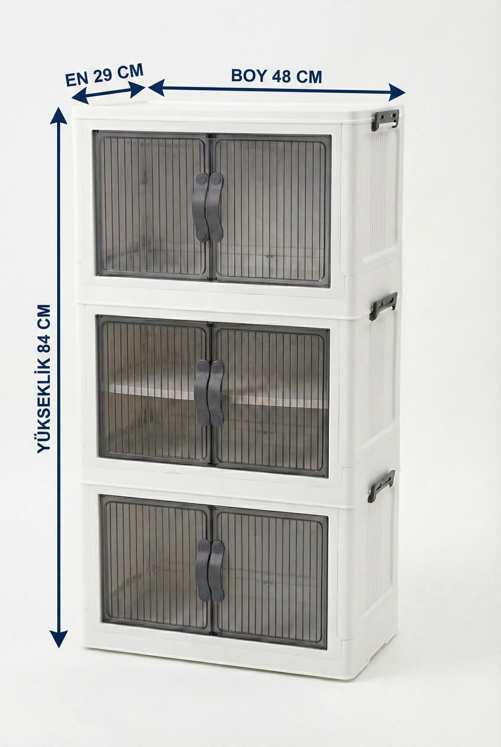 Modüler Tasarım: Üç katlı yapısı sayesinde dikey alanlarda maksimum saklama kapasitesi sunar.