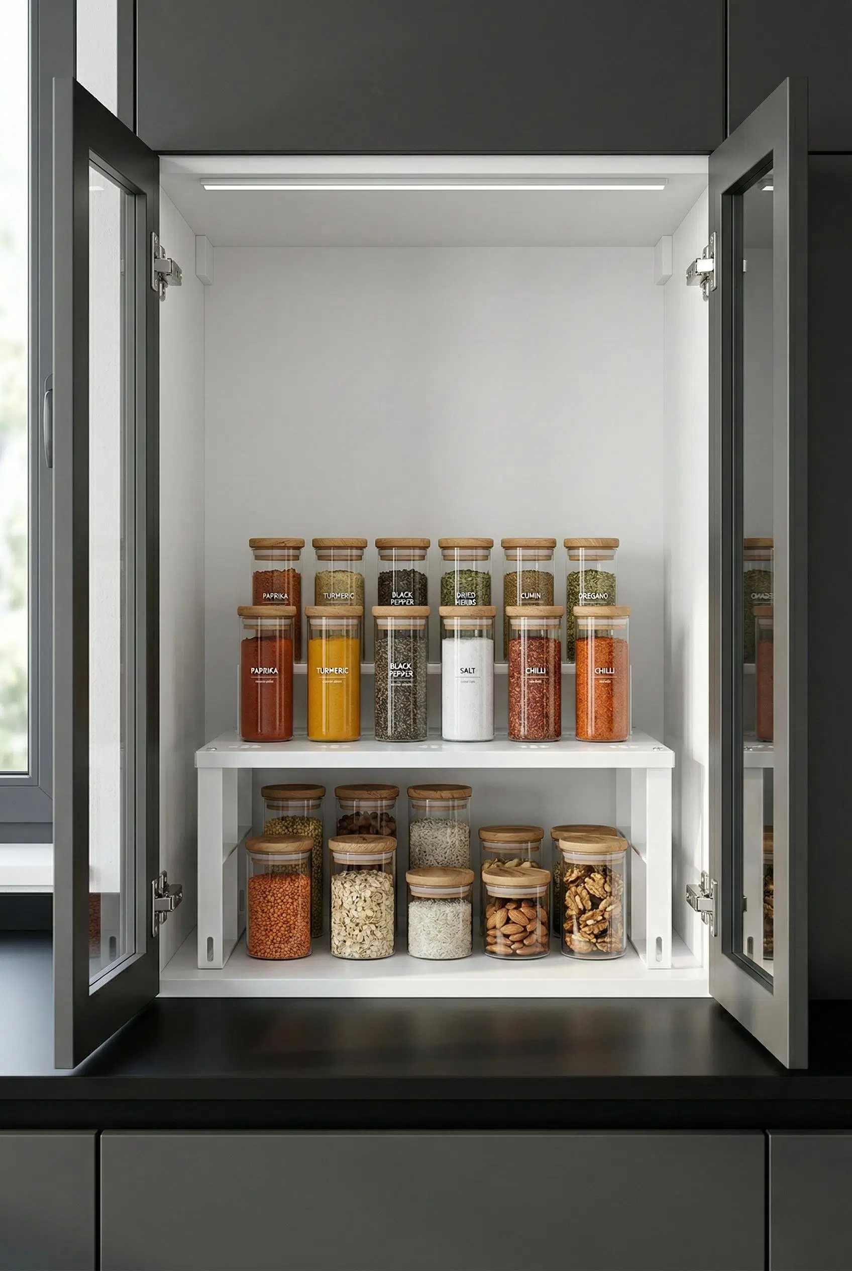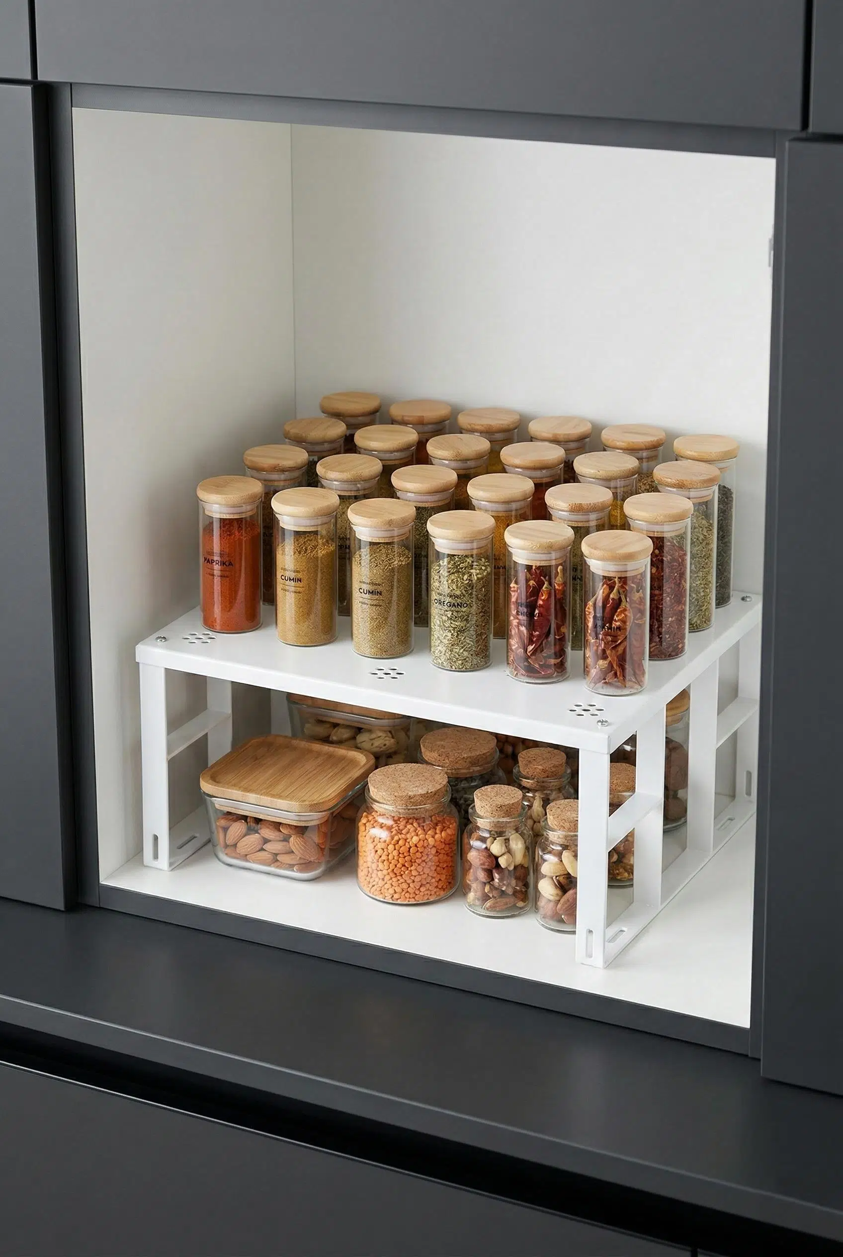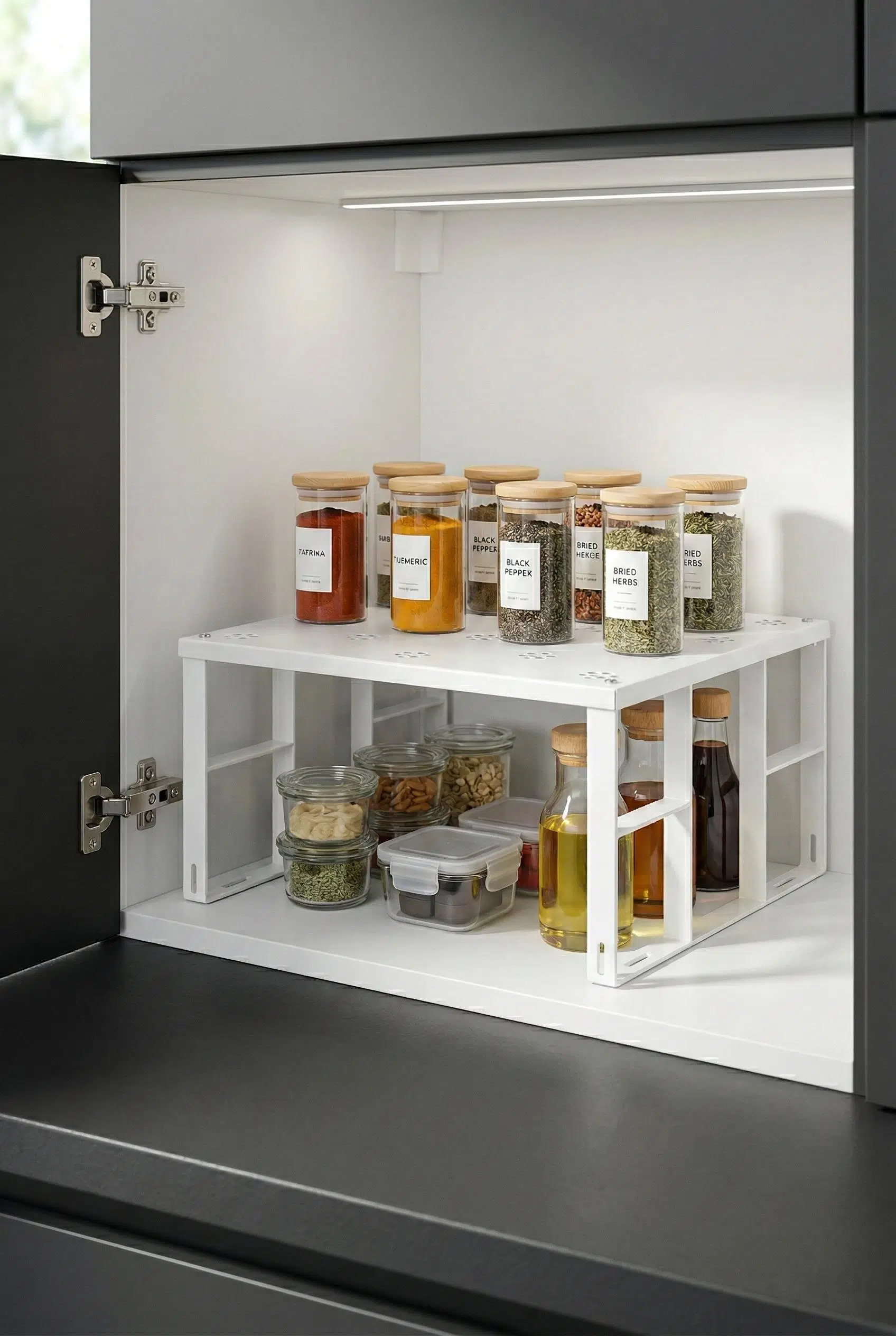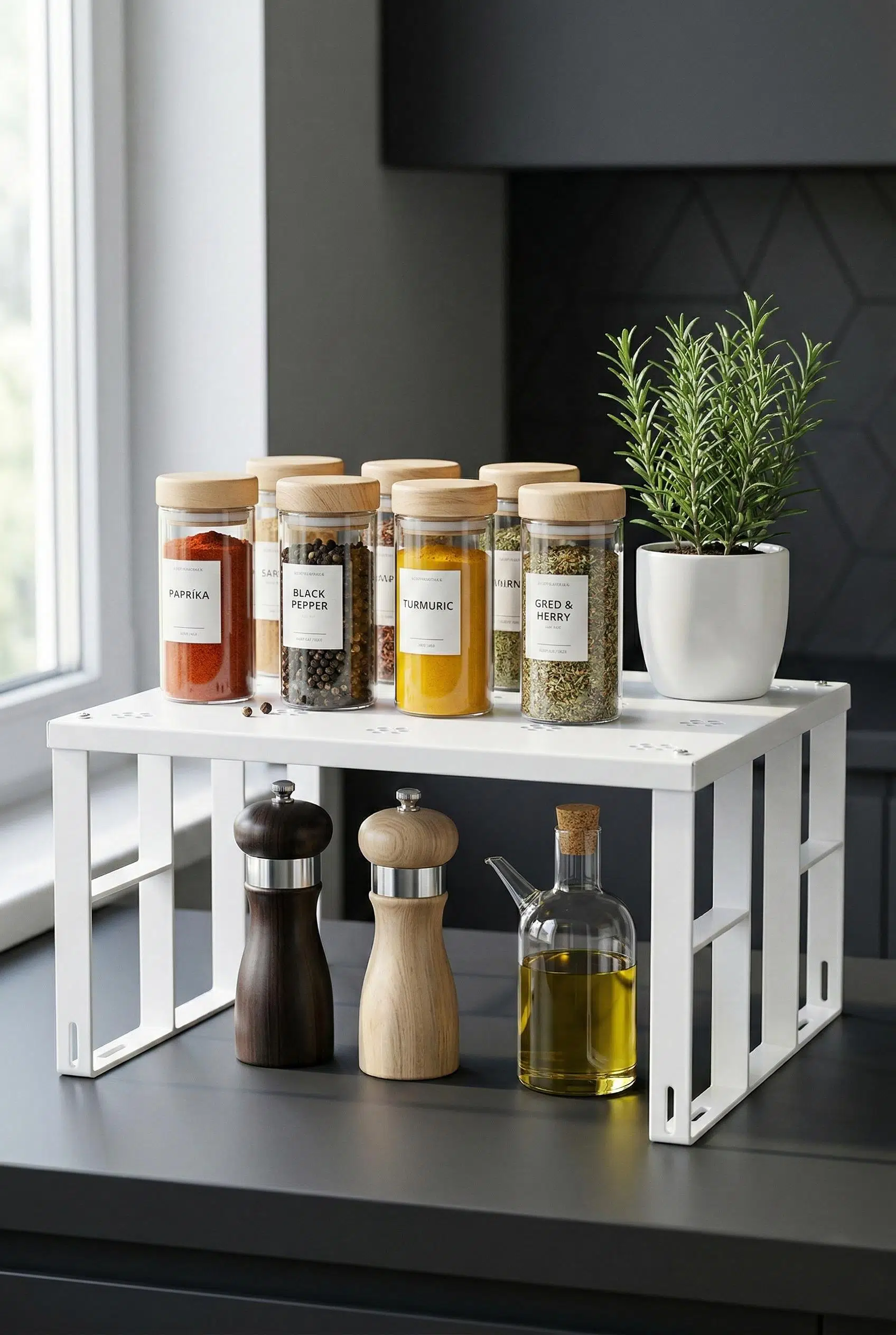 Mutfak dolaplarınızdaki ve tezgah üzerindeki dağınıklığı sona erdirmek için tasarlanan bu sağlam metal raf, dikey alan kullanımı sağlayarak depolama kapasitenizi anında iki katına çıkarır.