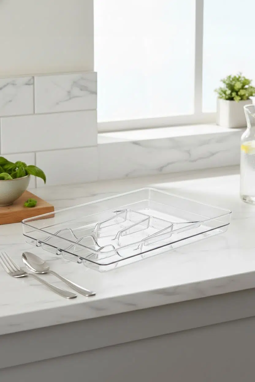 Mutfak çekmecelerinde düzeni korumak artık çok kolay! Şeffaf akrilik raf içi kaşıklık, çatal, bıçak ve kaşıklarınızı düzenli bir şekilde saklamanıza yardımcı olur. Şık tasarımı sayesinde hem sade hem de modern bir görünüm sunar. Kaymaz tabanı ve dayanıklı yapısı ile uzun süreli kullanım sağlar.